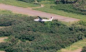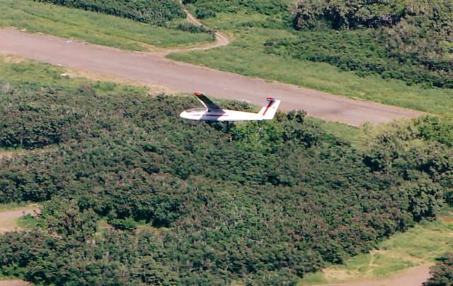 The trail ascends a cliffside south of Dillingham's runway in a series of switchbacks and lets you watch the airport activity from pattern altitude at about the distance of a downwind leg. The hike up takes about 40 minutes for someone who is fit, over an hour for the leisure crowd. The view of the airfield is a remarkable perspective in itself, but since Dillingham is used extensively for glider flying and the best lift can be found right up against the hillside, you get to enjoy the local gliders way up close and personal.