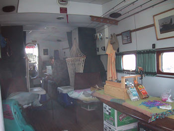 Inside the Hemisphere Dancer- Surfboard, fly rods, hammocks, Highly suggested to click on image and view high resolution version.